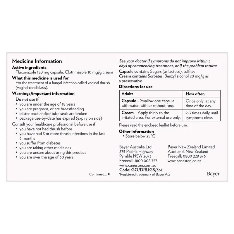 Capsule contains lactose and cream contains 20mg/g benzyl alcohol as a preservative. Do not use if pregnant, likely to become pregnant, or are breastfeeding, you are under 18 years of age, blister pack and/or tube seals are broken, package use by date has expired. Seek medical advice before first course of treatment, or if you have had 3 or more infections in the last 6 months. See a doctor if no better after 3 days. See a doctor if problem returns. See a doctor before use if you are diabetic, you are taking warfarin or other medicines, you are unsure about using this product, or you are over the age of 60 years.