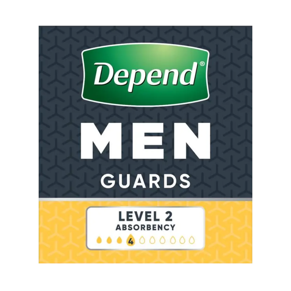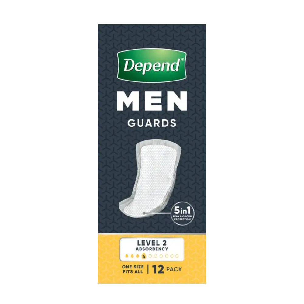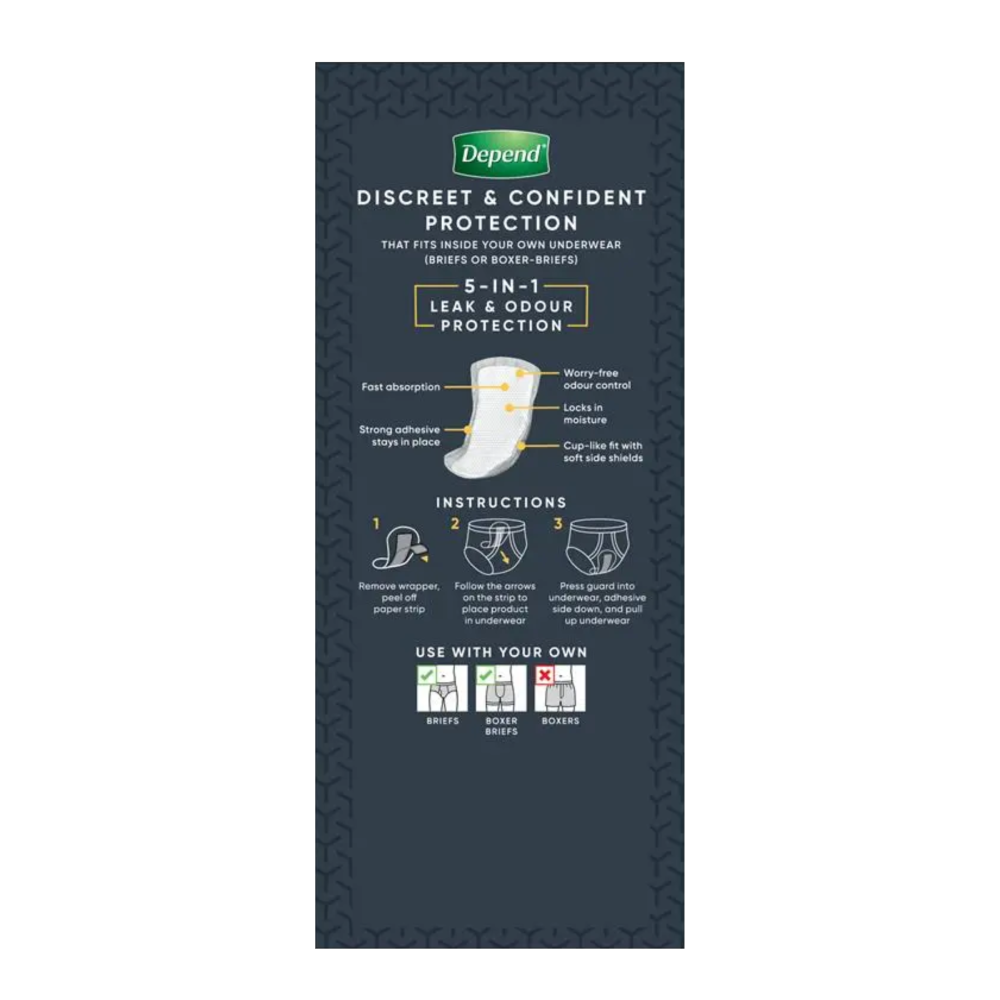 Designed with the male anatomy in mind, Depend Men Level 2 Guards deliver targeted 5-in-1 leak and odour protection for discreet coverage against moderate bladder leakage.