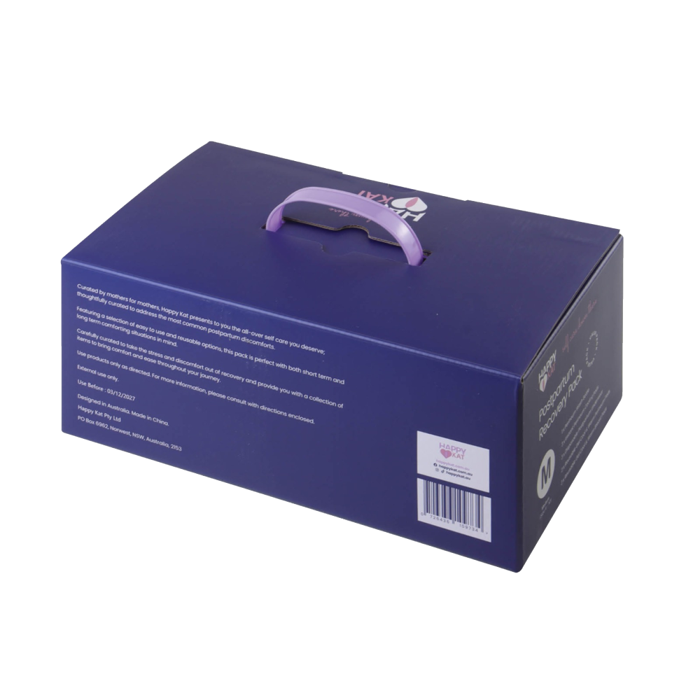Happy Kat Postpartum recovery kit. Carefully curated to take the stress and discomfort out of recovery and provide you with a collection of items to bring comfort and ease throughout your journey. Curated by mothers- for mothers. Happy Kat understands what you need during all stages of your postpartum recovery.