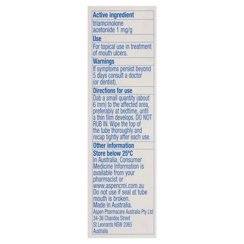KENALOG IN ORABASE provides fast acting treatment for mouth ulcers and oral abrasions. It contains a corticosteroid called triamcinolone acetonide that reduces inflammation and discomfort.