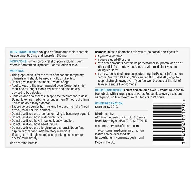 Active Ingredients: Maxigesic film coated tablets contain paracetamol 500mg and ibuprofen 150mg.